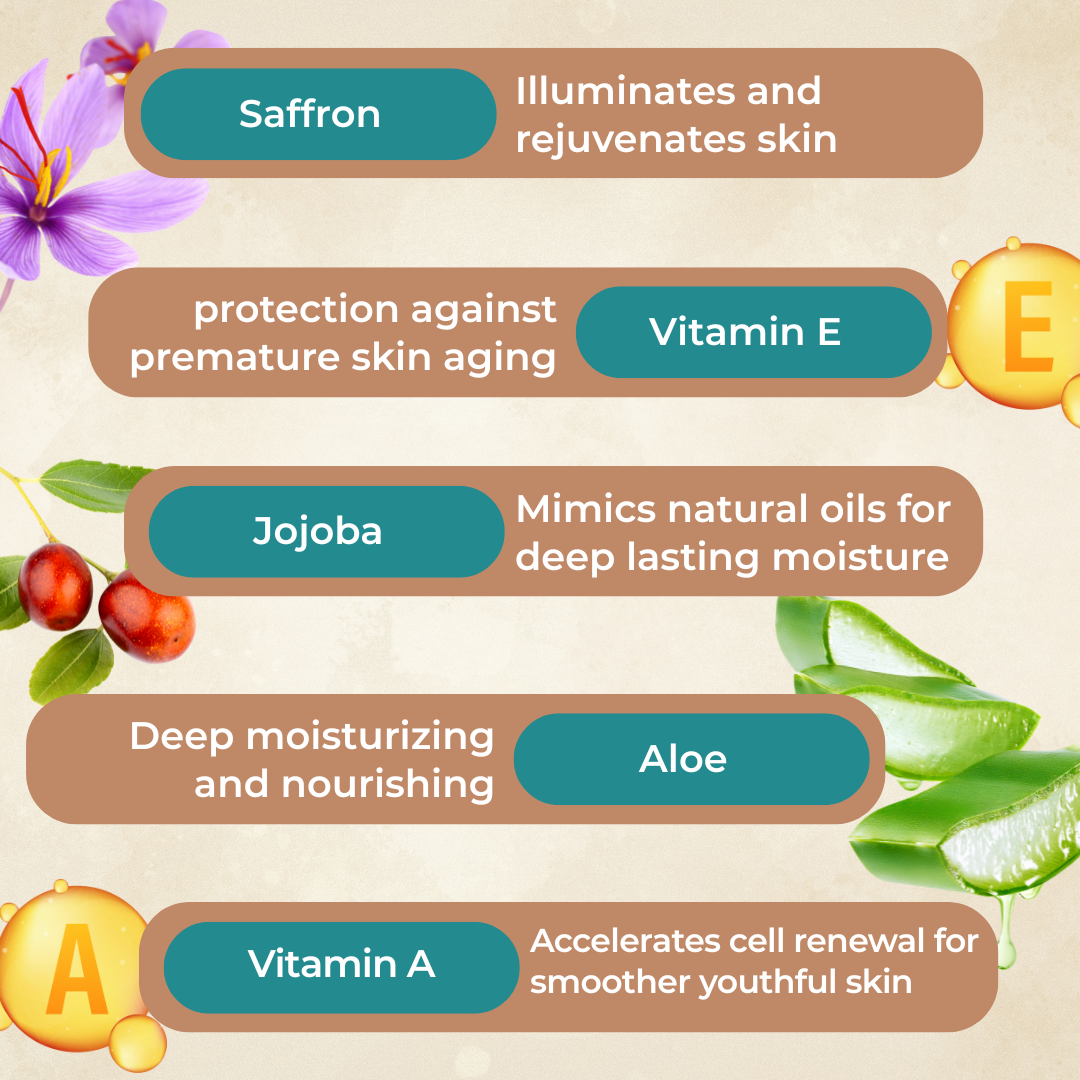 The Art of Botanical Excellence Our exclusive blend marries the timeless wisdom of ancient beauty secrets with modern skincare science. Rare saffron threads work alongside sacred lotus extracts and nourishing rose petals to create a formula that doesn't just moisturize—it restores your skin's natural luminosity. Enriched with vitamin-rich wheat germ, protective almond oil, and moisture-locking jojoba, each application delivers intensive nourishment that penetrates deeply, leaving skin supple and resilient.