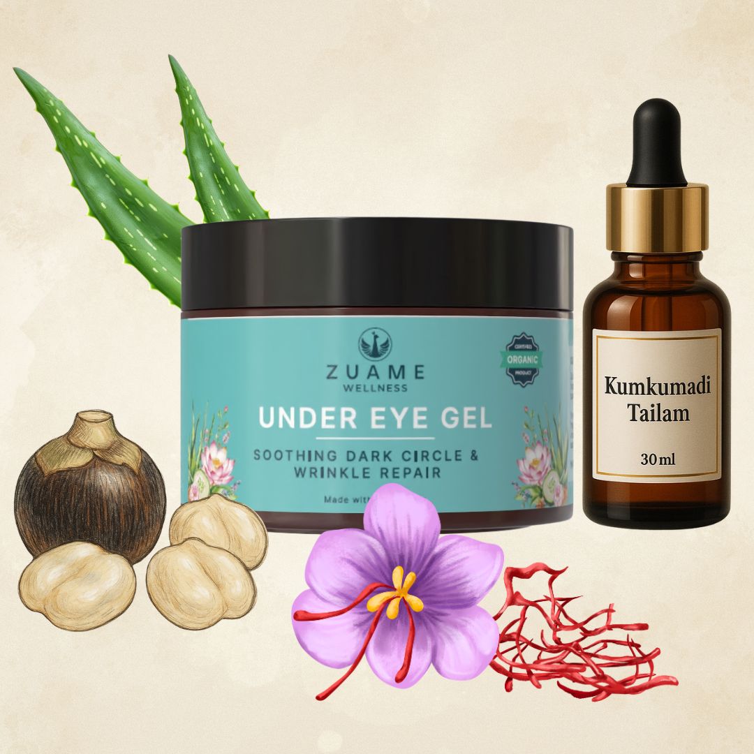 - Kumkumadi Tailam – Targets dark circles and pigmentation with ancient radiance-enhancing herbs