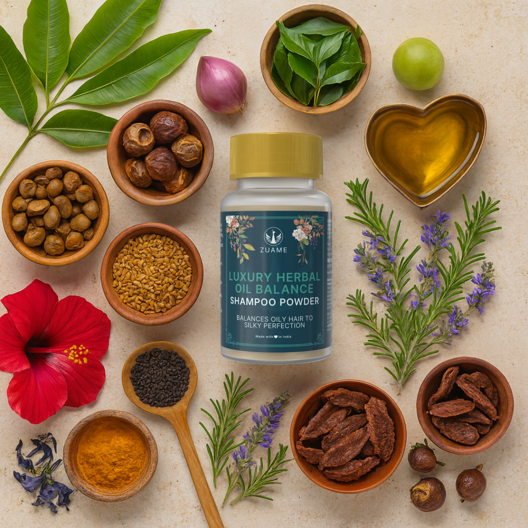 Zuame’s Luxury Herbal Oil Balance Shampoo Powder is a refined blend of ancient herbs and oils, carefully chosen to cleanse your hair after an oil massage without disturbing your scalp’s natural balance. It removes only the excess, keeping the goodness of your treatment intact.